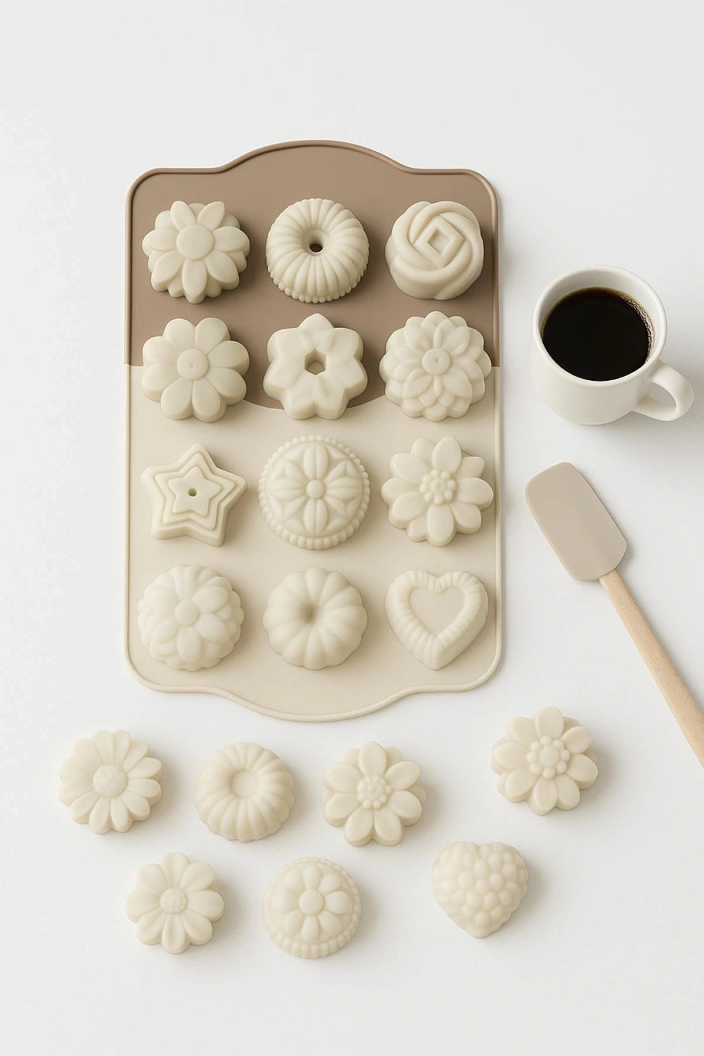 12 bölmeli silikon kalıp, kek ve çikolata yapımında pratiklik sağlar. Yapışmaz yapısı sayesinde kolayca çıkarma imkânı sunar. Krem rengi şık tasarımıyla hem ev hem profesyonel mutfaklar için uygundur.