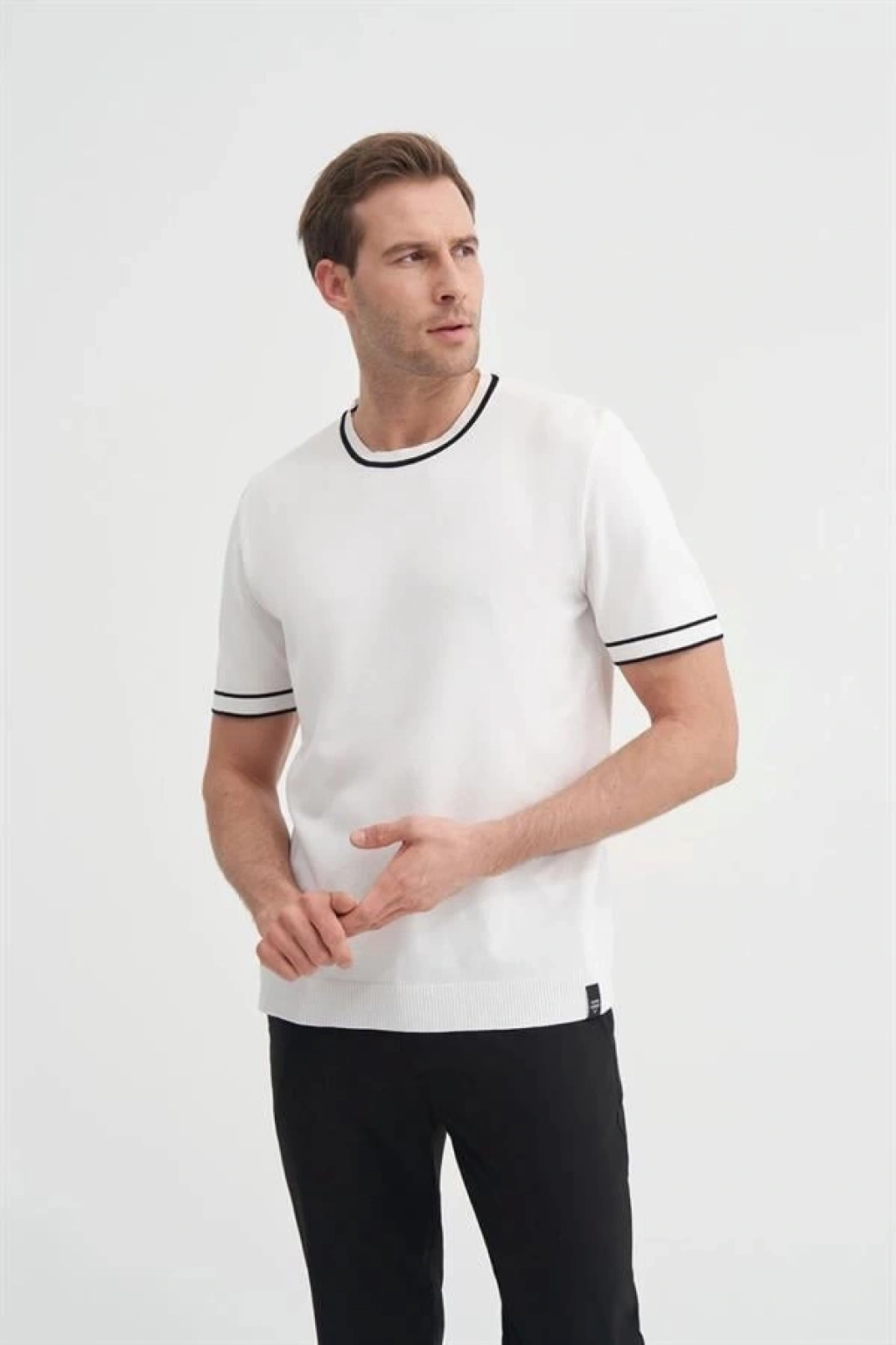 3013 Bisiklet Yaka Bel ve Kol Lastikli Triko Erkek T-Shirt BEYAZ