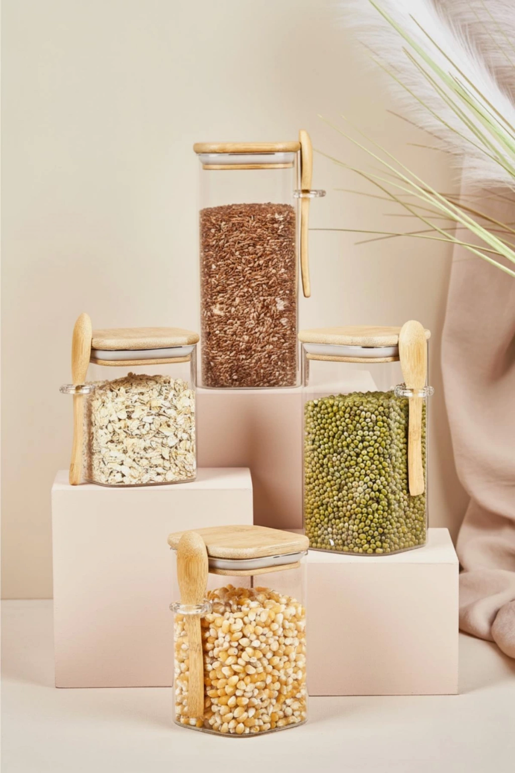 Mutfakta hem düzen hem de estetik arayanlar için tasarlanan bu 4’lü cam kavanoz takımı, bambu kapaklı ve kaşıklı yapısıyla öne çıkar. 950 ml geniş hacmiyle baharat, bakliyat, kahve, şeker ve kuruyemiş gibi birçok ürünü sağlıklı ve şık şekilde saklamanıza yardımcı olur.