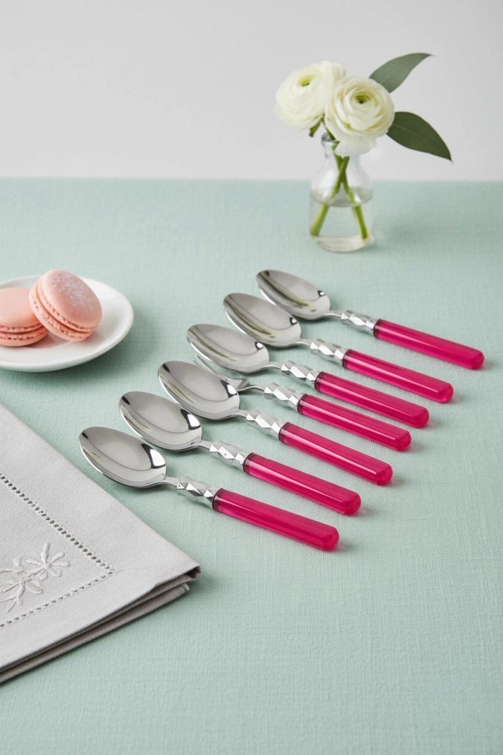 Pastel pembe rengiyle sofralara zarif bir dokunuş katan 6’lı paslanmaz çelik tatlı kaşığı seti, tatlı sunumlarını şık hale getirir. Dayanıklı paslanmaz çelik gövdesi ve estetik tasarımıyla uzun ömürlü kullanım sağlar.