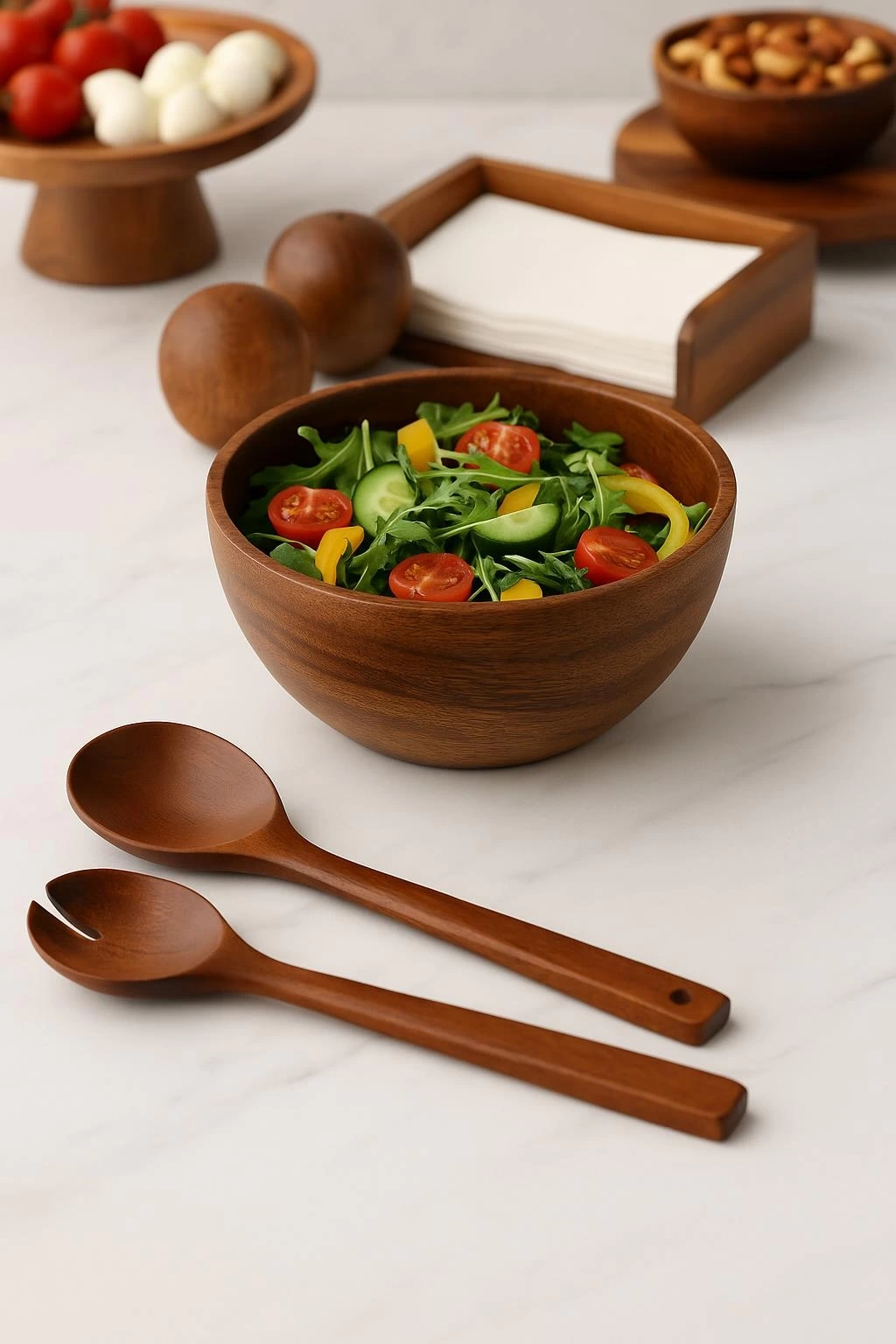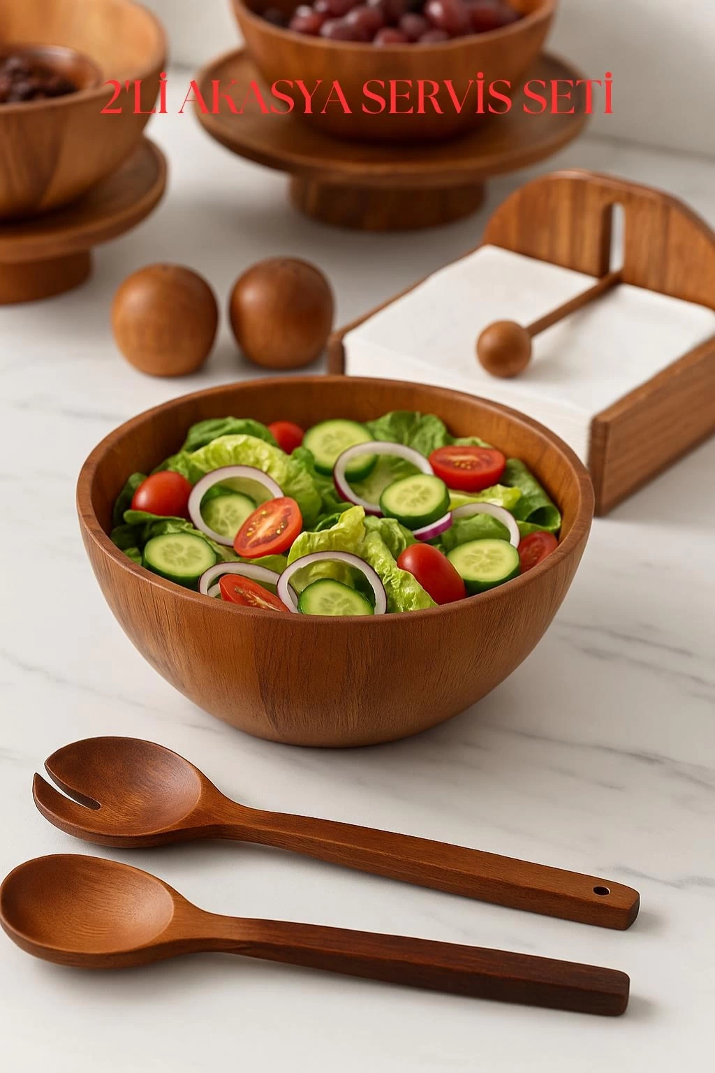 Ürün Hikayesi: Doğal akasya ağacının sıcak dokusunu sofranıza taşıyan bu salata servis seti, şık ve işlevsel sunumlar için idealdir.