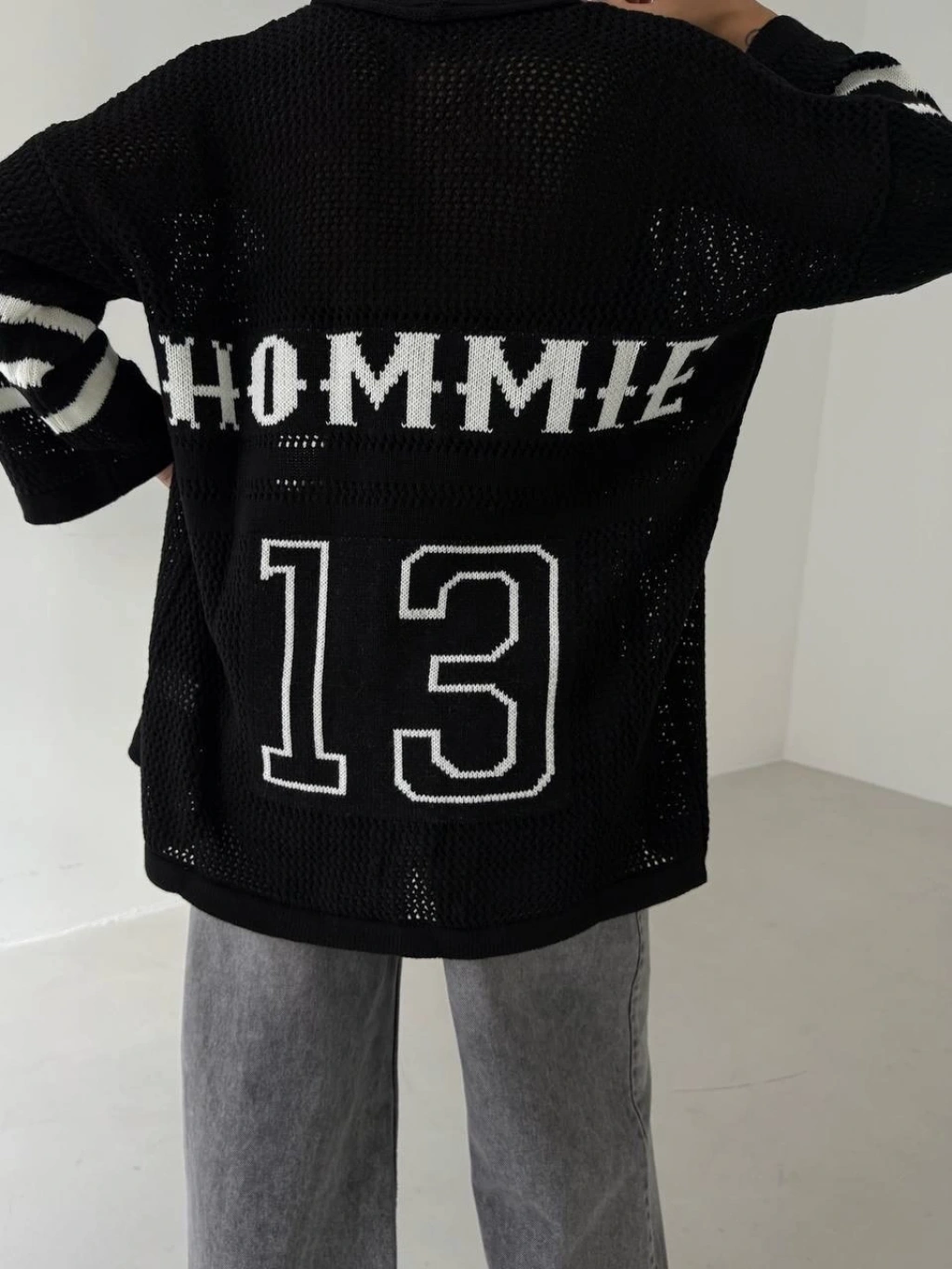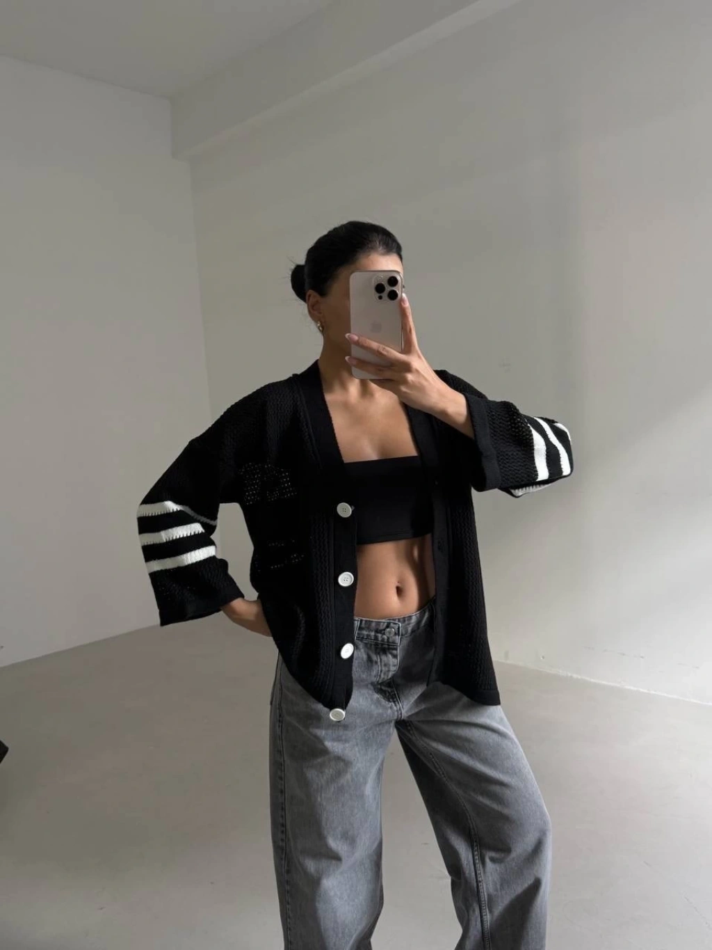 Büyük düğmeli salaş triko hırka siyahbeyaz