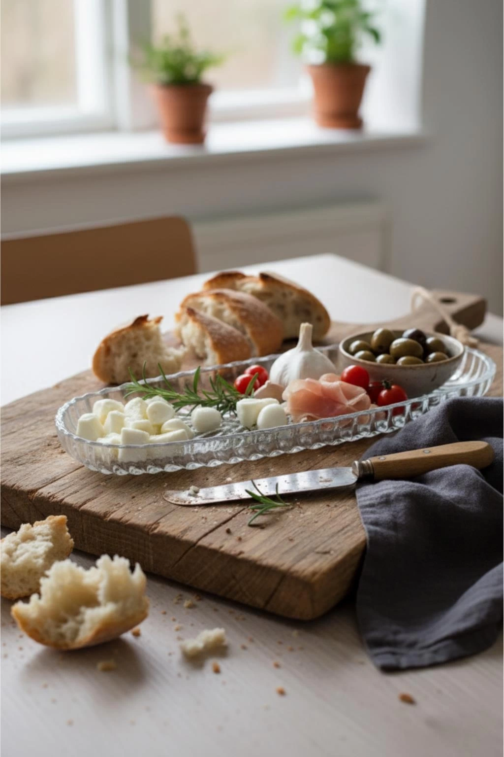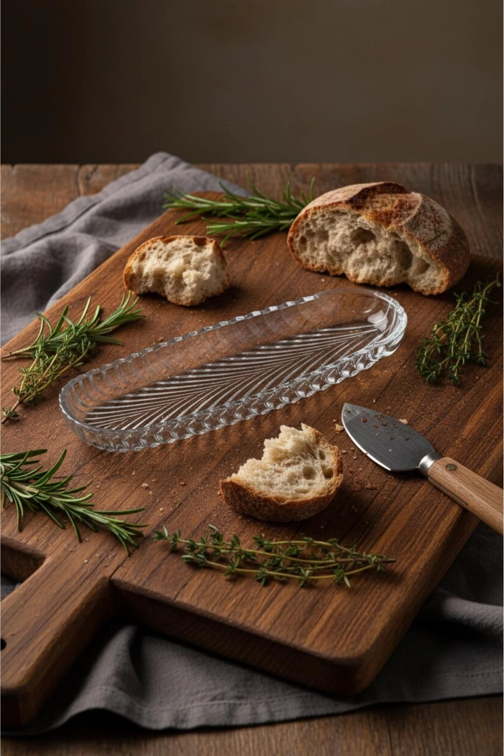 Özel davetlerden günlük sofralara kadar şıklık katan cam balık sırtı baton sunum tabağı, peynir, zeytin, şarküteri ürünleri ve atıştırmalıklar için idealdir. Sofralara estetik bir dokunuş katar.