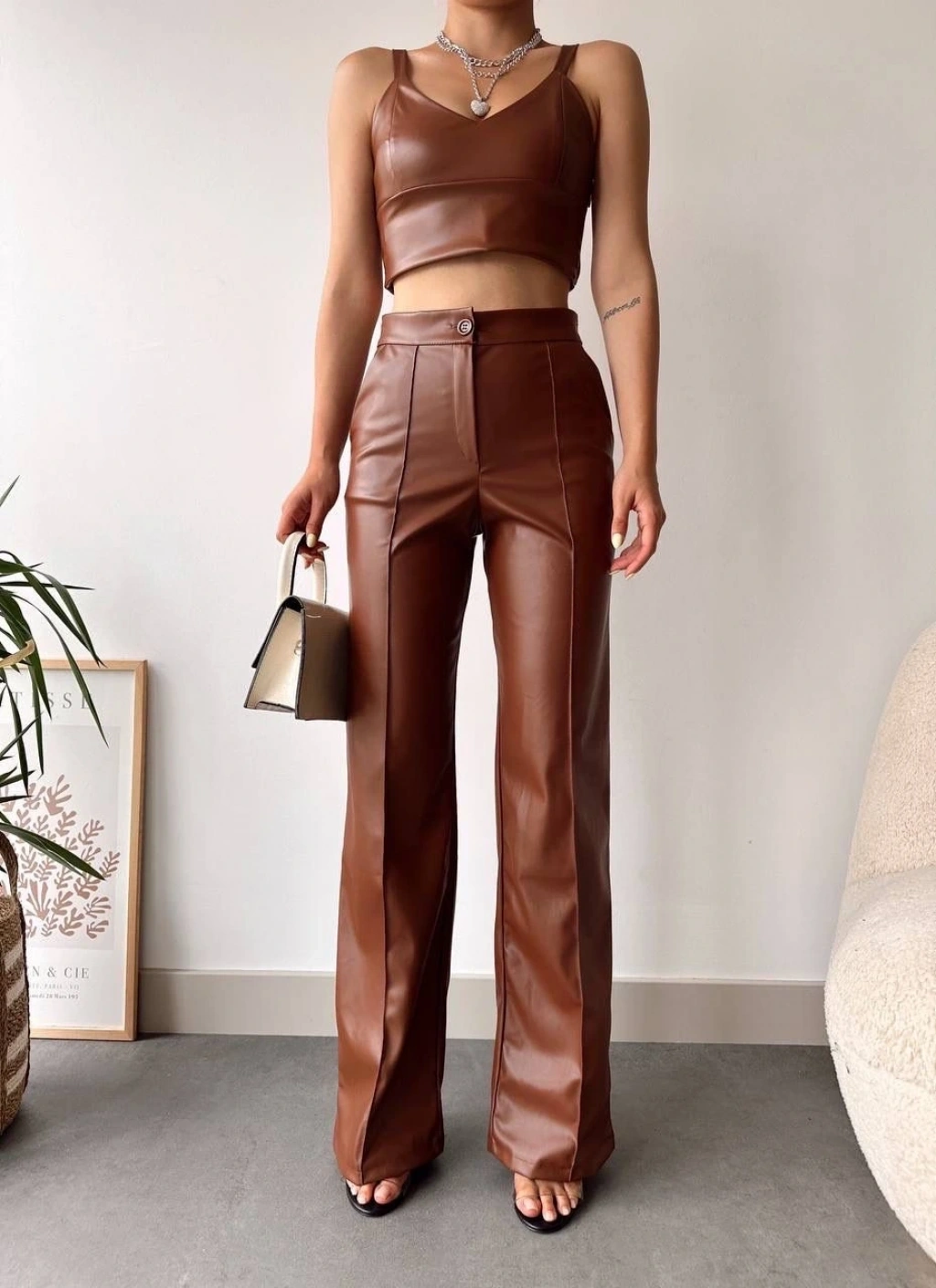 Yüksek bel tasarımı ve geniş paçası ile şıklığı ve rahatlığı bir arada sunan Deri Palazzo Pantolon, gardırobunuzun vazgeçilmezi olmaya aday! Kahve rengi ile hem klasik hem de modern kombinlerde şık bir seçenek sunar.
