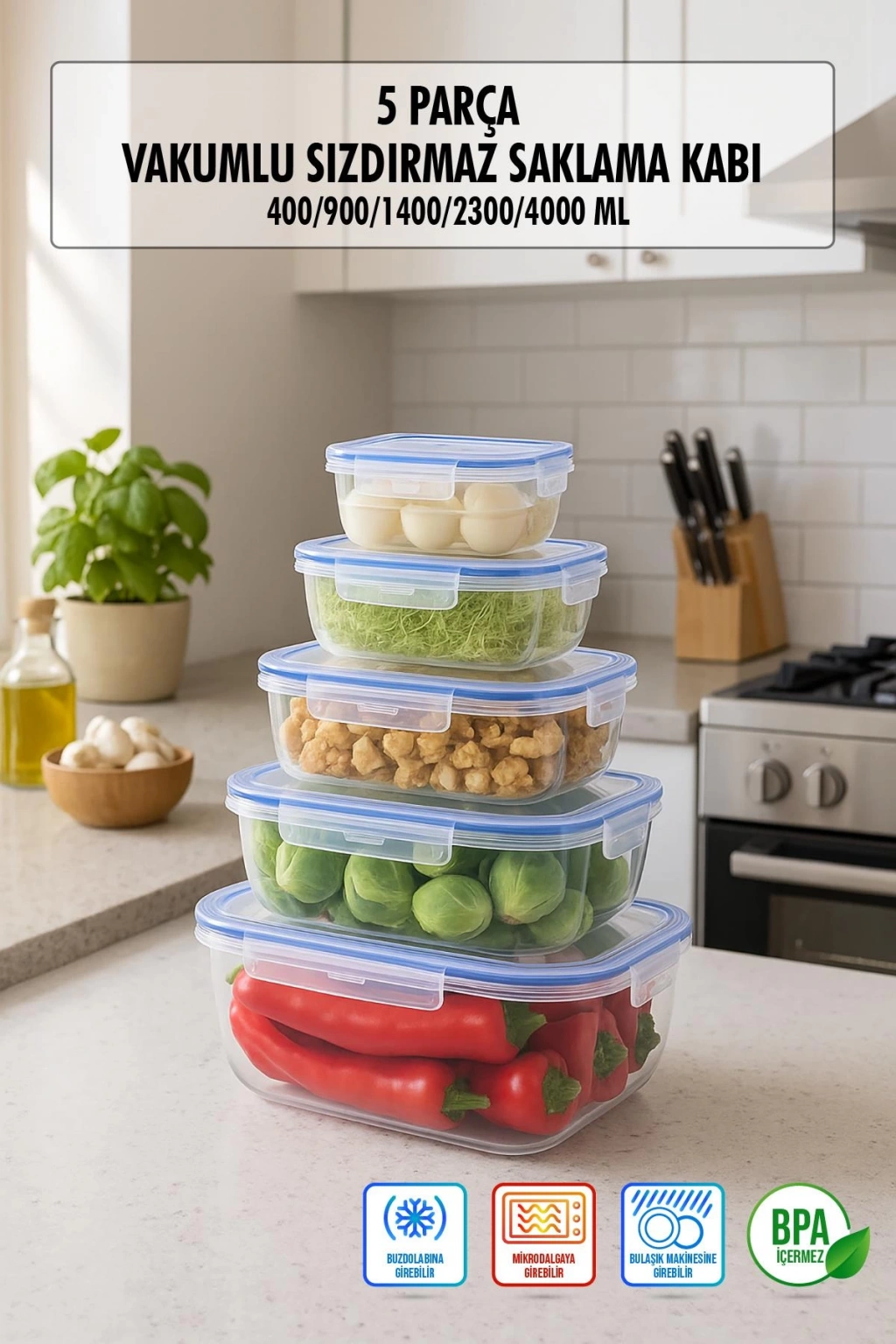 Ürün Hikayesi: Dikdörtgen 5 Parça Contalı Vakumlu Sızdırmaz Hava Almaz Saklama Kabı Seti, yiyeceklerinizi uzun süre taze tutmak için tasarlanmıştır. Farklı boyutlarıyla günlük kullanımda her ihtiyaca cevap verir. Vakumlu ve contalı yapısı sayesinde hava geçirmez, sızdırmaz kapakları ile güvenli kullanım sağlar. Şeffaf tasarımıyla içindekiler kolayca görülebilir, buzdolabından pikniğe kadar pek çok alanda kullanıma uygundur.