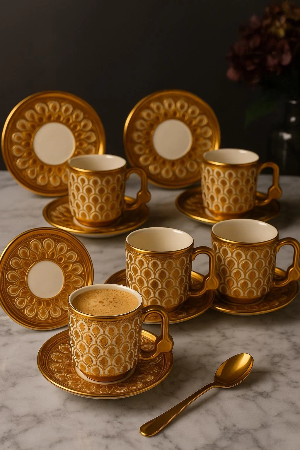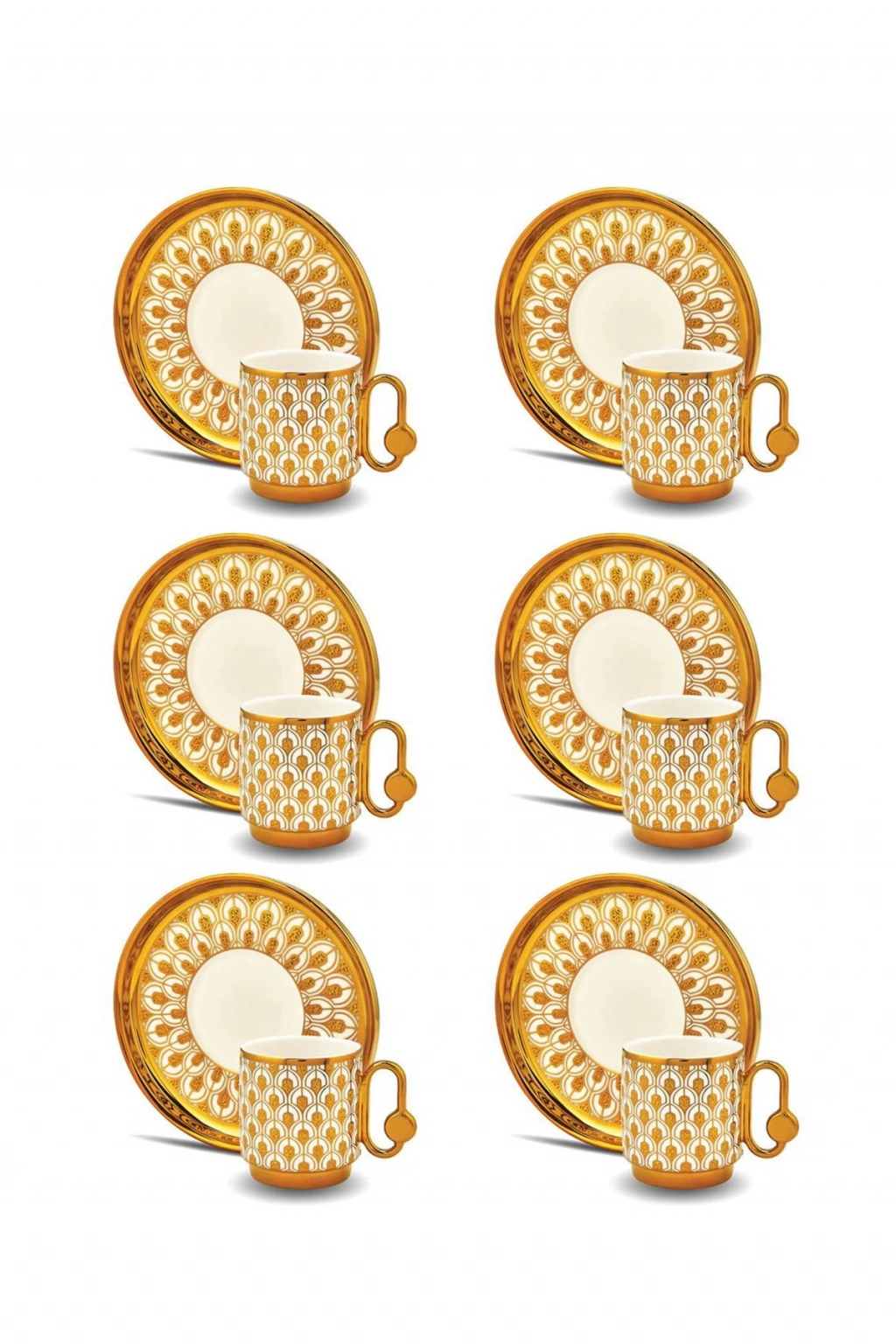 Zarif gold detaylarla süslenmiş bu porselen kahve fincan seti, misafirlerinize ikram edeceğiniz kahvelere şıklık katar. İnce işçiliği ve göz alıcı deseniyle hem günlük hem de özel davetlerde sofralarınızı tamamlar.