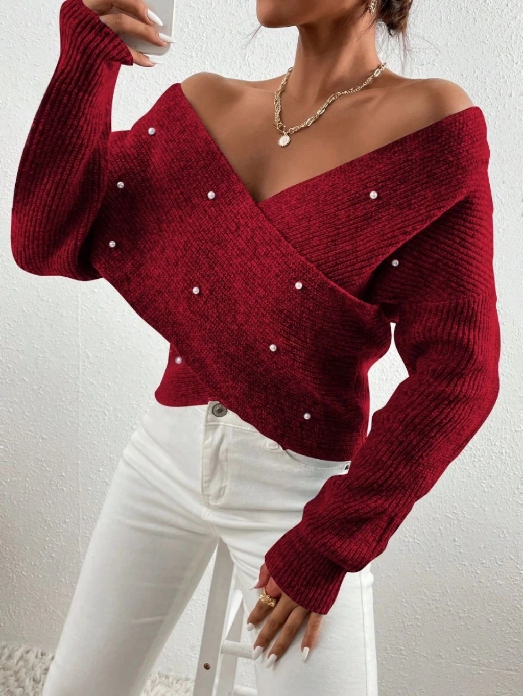 İncili Çapraz Kazak Bordo, şıklığı ve rahatlığı bir arada sunar.
