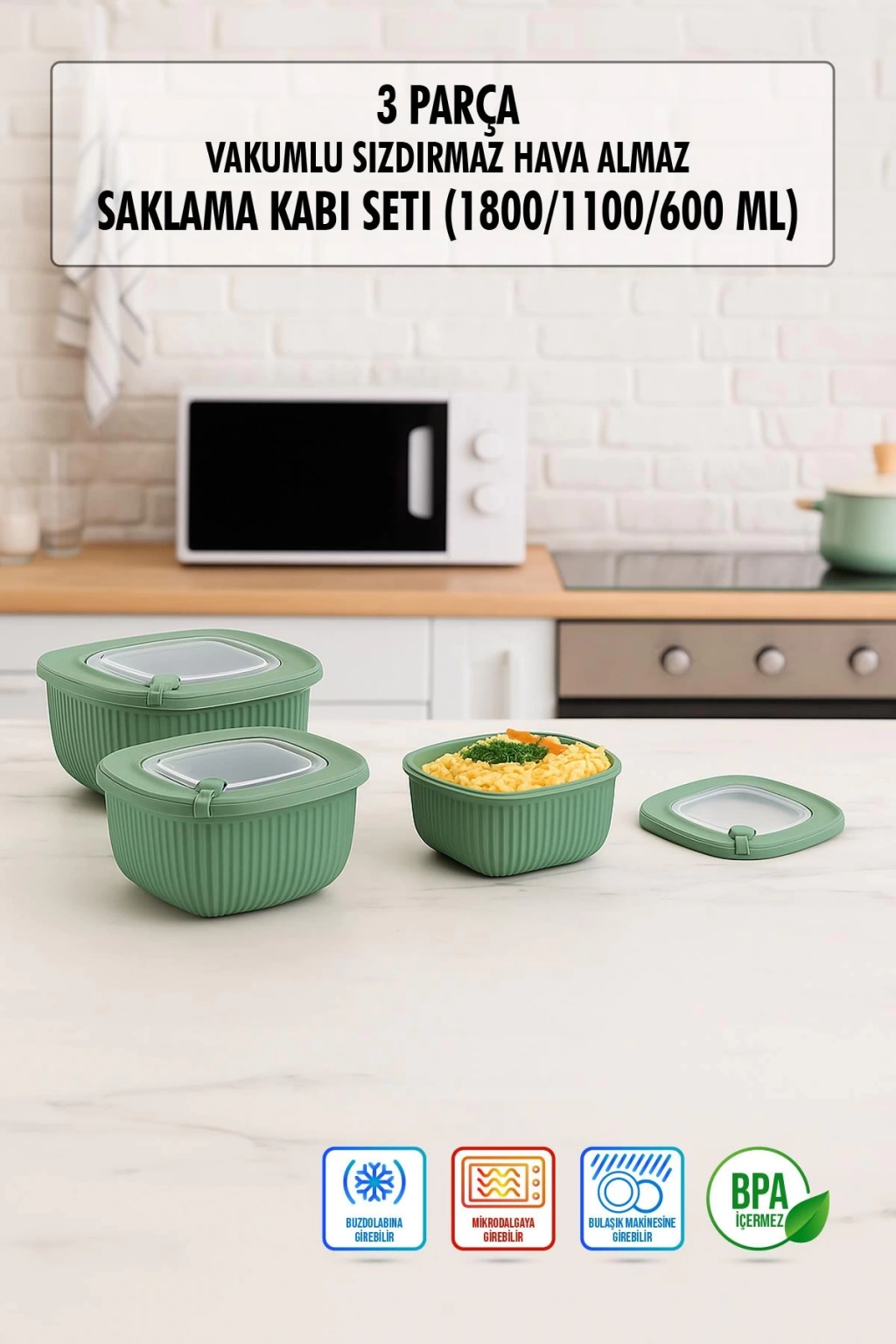 Ürün Hikayesi: Kare 3 Parça Vakumlu Sızdırmaz Hava Almaz Saklama Kabı Seti, modern tasarımı ve renk seçenekleri ile mutfağınıza şıklık katar. Farklı boyutlardaki kapları sayesinde yiyeceklerinizi güvenle ve uzun süre taze tutmanıza yardımcı olur. Vakumlu ve contalı yapısı sayesinde hava geçirmez, sızdırmaz kapakları ile her alanda güvenle kullanılabilir.