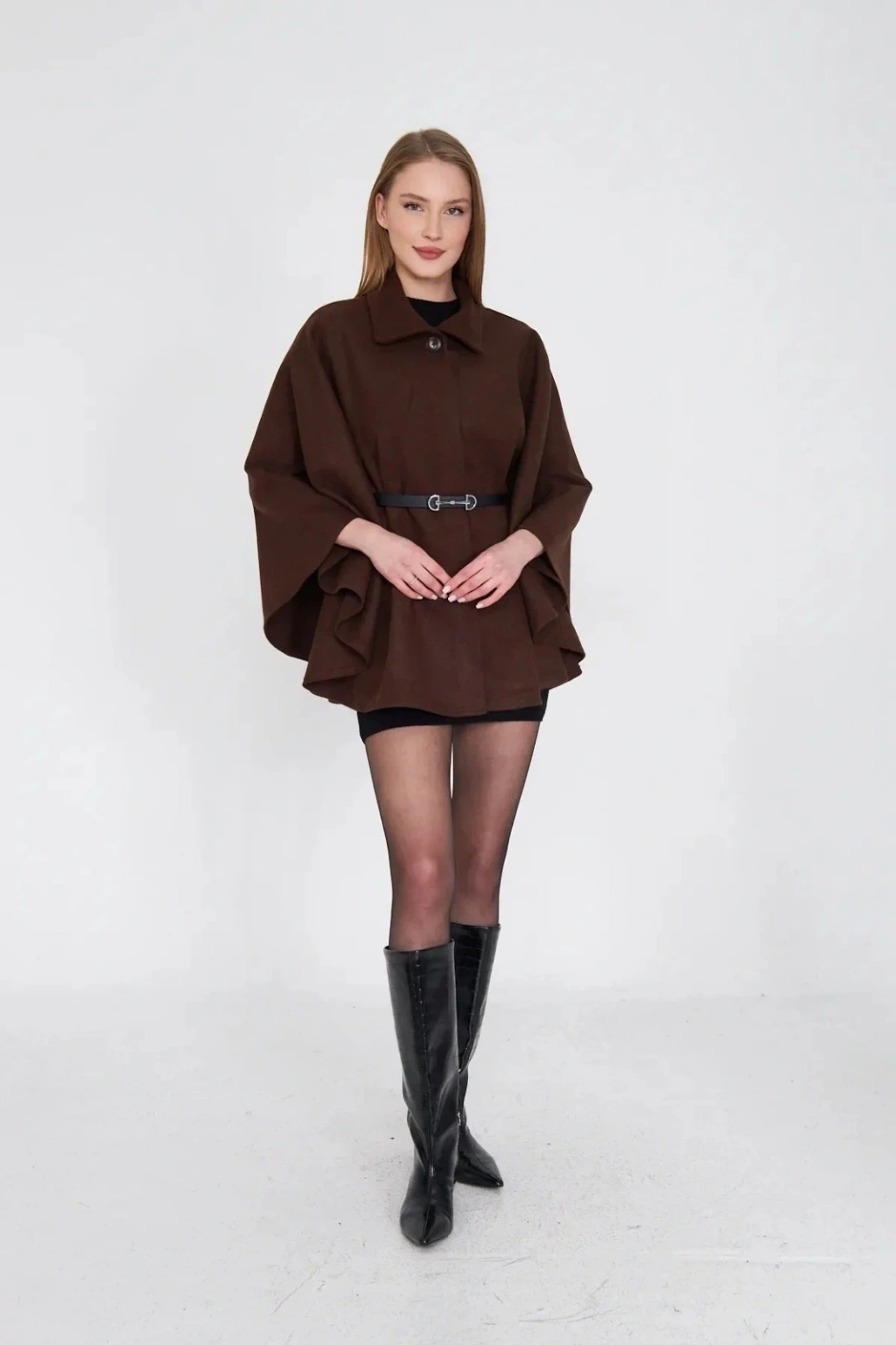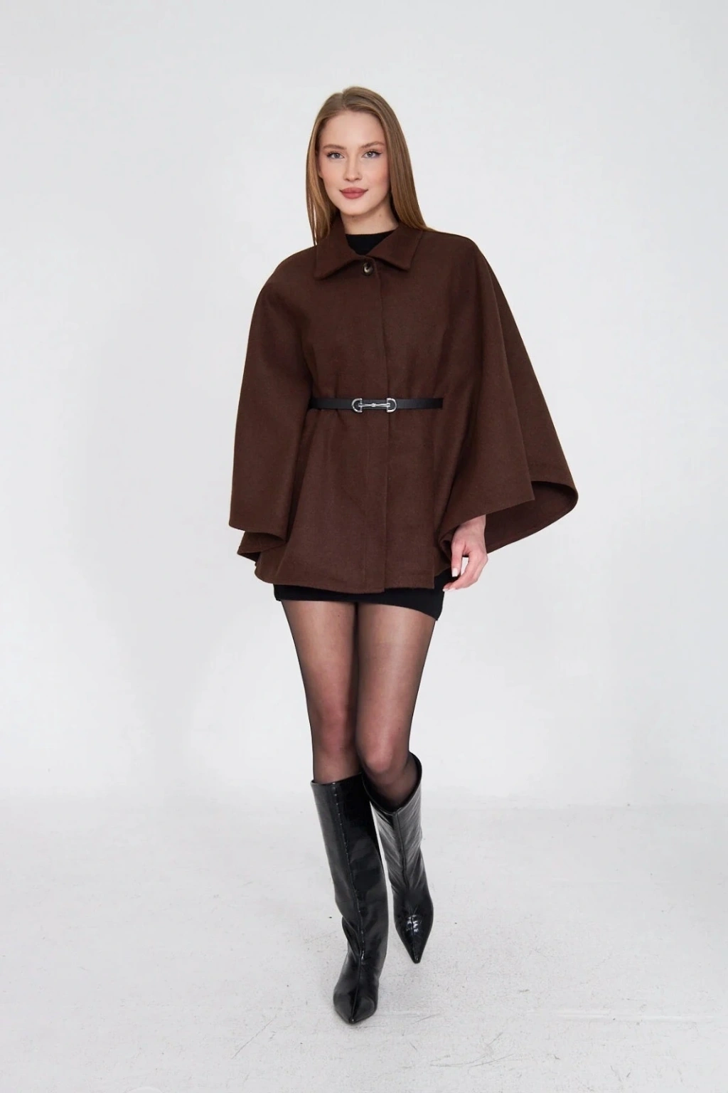 Kahve rengi kemerli kaşe panço şıklık ve rahatlığı bir arada sunuyor. Soğuk havalarda sıcacık tutarken, şık tasarımıyla her kombini tamamlıyor.