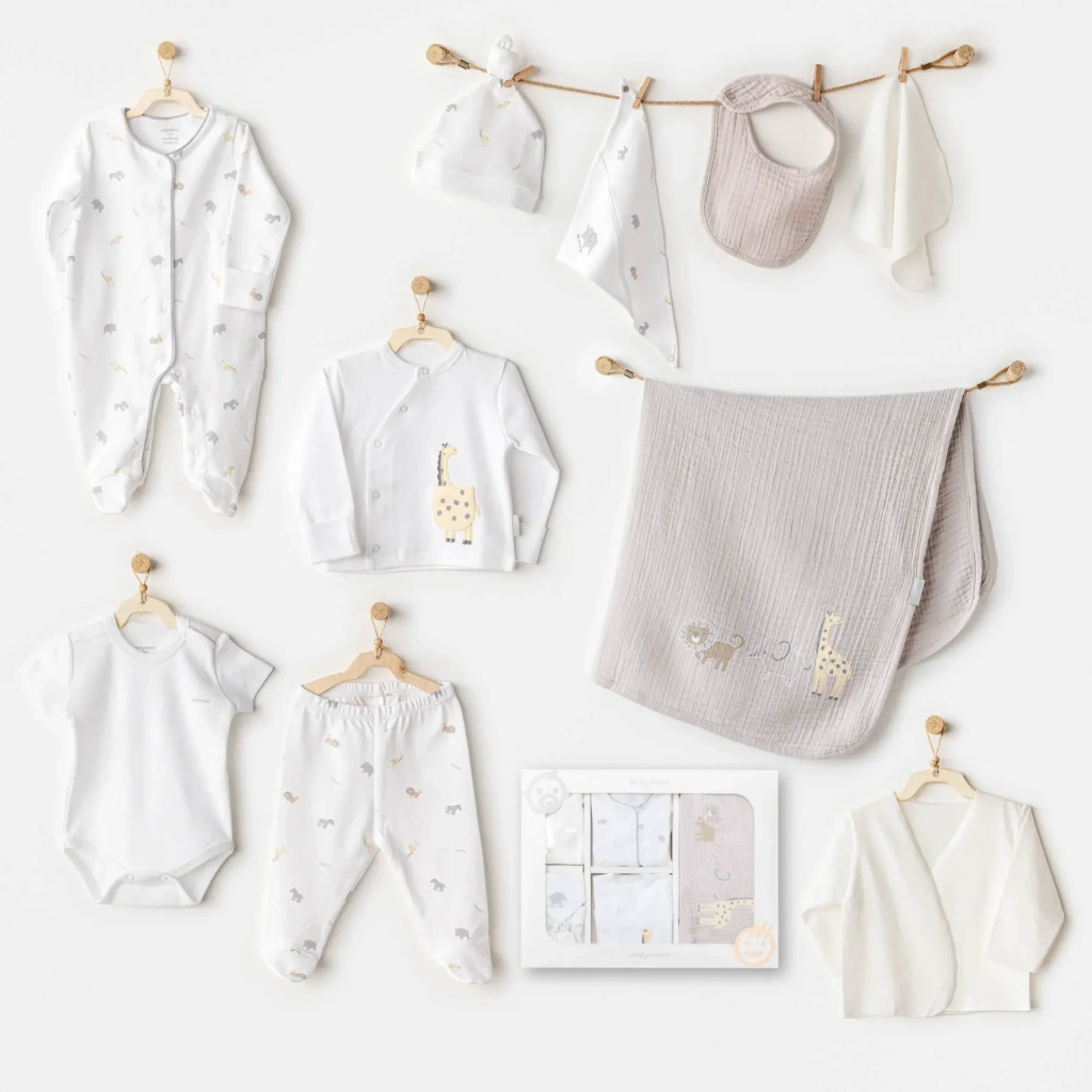 Ürünlerimiz bebeğinizin sağlığı düşünülerek birinci sınıf ham maddelerden üretilmiştir. Azo-Free boya ve Nikel- Free aksesuarları ile uluslararası üretim teknikleri ve güvenlik standartlarına sahiptir. Benzer renklerle birlikte yıkayınız. Yüksek kalite standartları Oeko-Tex belgesi ile tescillenmiştir. Kumaş Özellikleri: %100 Pamuk. Ürün İçeriği: 1 adet tulum. 1 adet dış zıbın. 1 adet iç zıbın. 1 adet body. 1 adet patikli pantolon. 1 adet battaniye. 1 adet şapka. 1 adet fular. 1 adet mama önlüğü. 1 adet temizleme bezi. Yıkama Talimatları: 30°C sıcaklıkta yıkayınız. Çamaşır suyu kullanmayınız. Düşük sıcaklıkta ütüleyniz. Tambur kurutma yapılmaz.