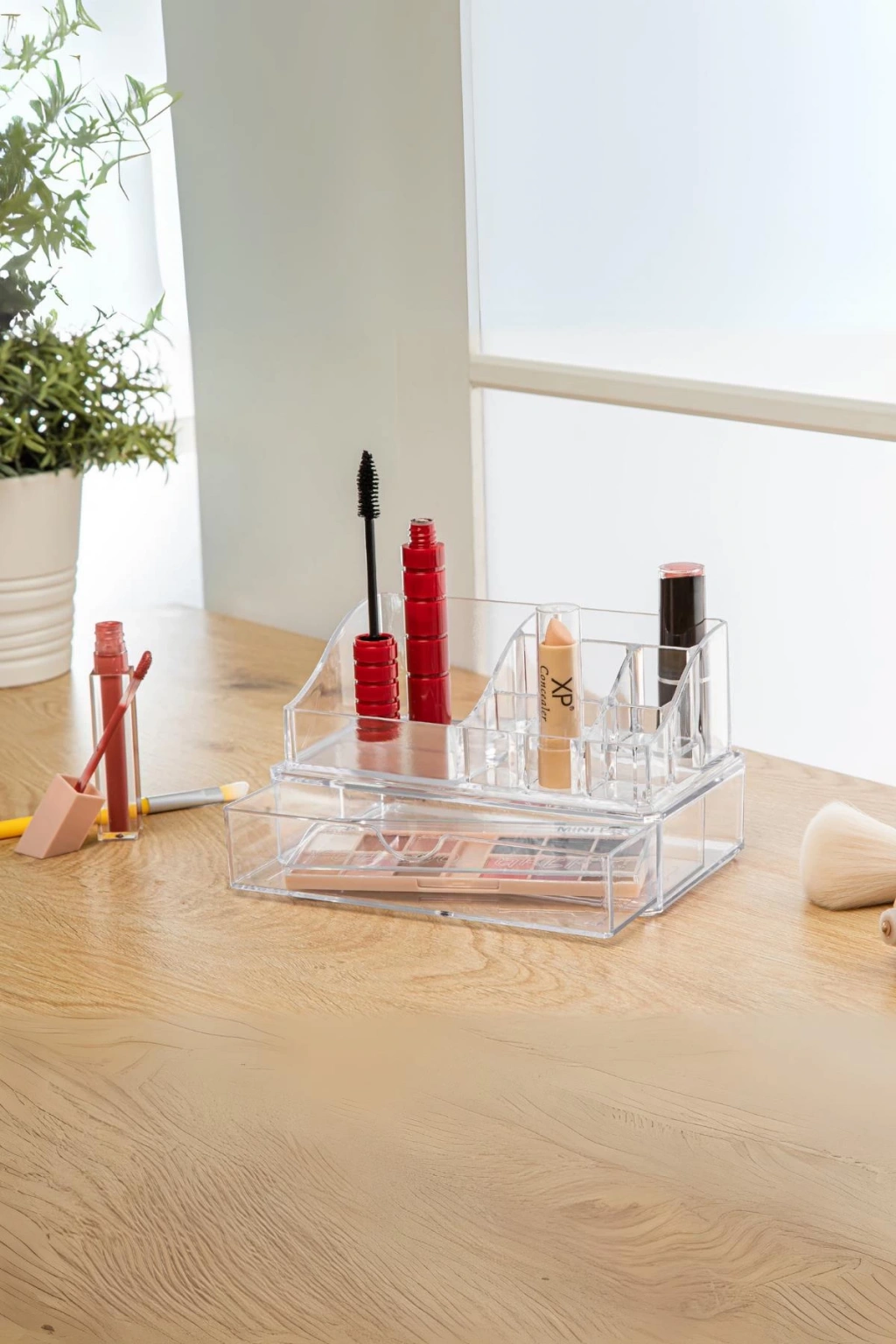 Ürün Hikayesi: Çok amaçlı makyaj organizeri, çekmeceli yapısı ve şeffaf tasarımı sayesinde hem kozmetik ürünlerinizi hem de takılarınızı düzenli bir şekilde saklamanızı sağlar. Masaüstünüzde şıklık ve pratik kullanım sunar.
