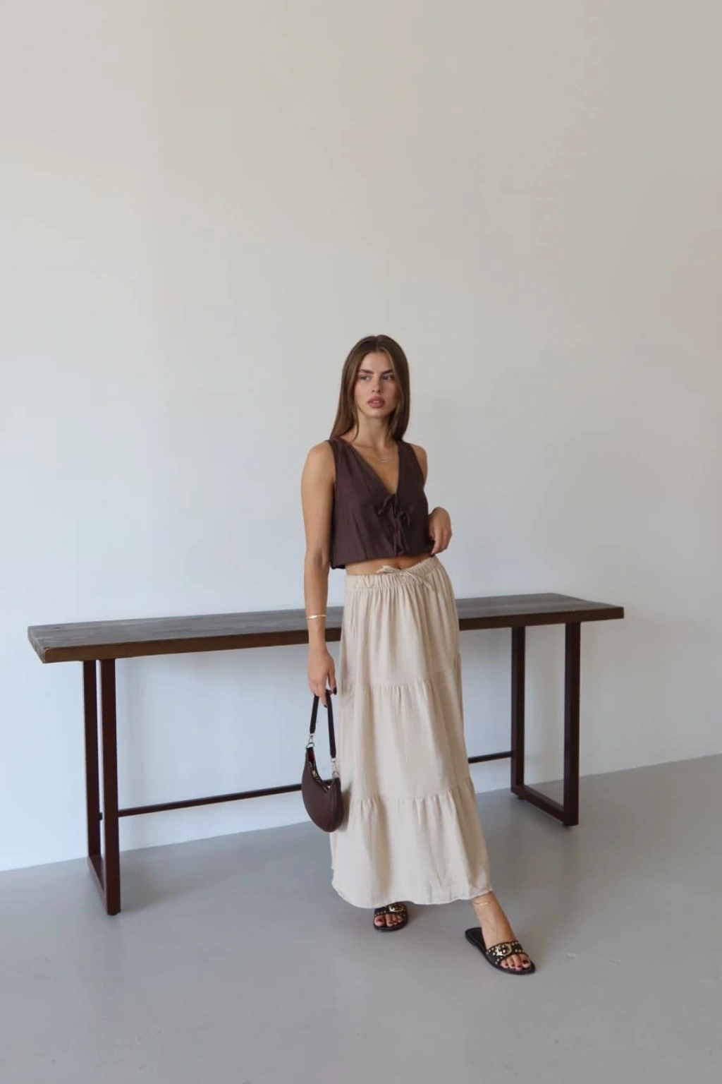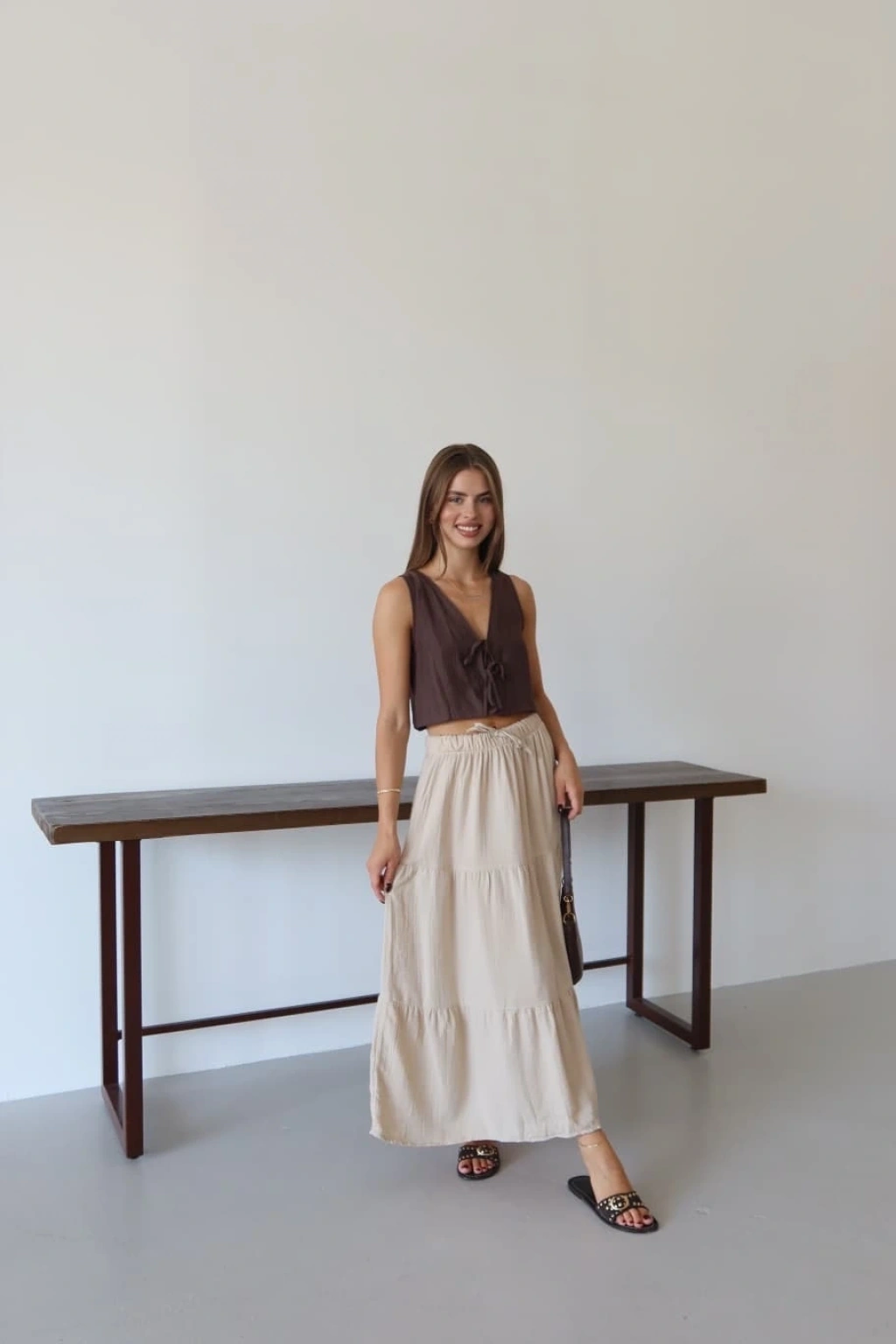 Yumuşak dokulu müslin kumaş ile tasarlanmış olan bu şık uzun etek, gardırobunuzun favori parçalarından biri olmaya aday. Hem şıklığı hem de rahatlığı bir arada sunan bej rengi, her tarza kolaylıkla uyum sağlar. Keten kumaşın sağladığı hafiflik ve doğal görünüm, yaz aylarında tercih edebileceğiniz ideal bir parça haline getiriyor.