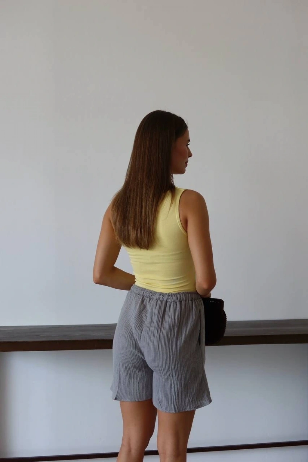 Modayı takip eden ve rahatlıktan ödün vermeyen kadınların tercihi Müslin Kumaş Şort Bağcıklı Gri PT ile stilinizi tamamlayın!