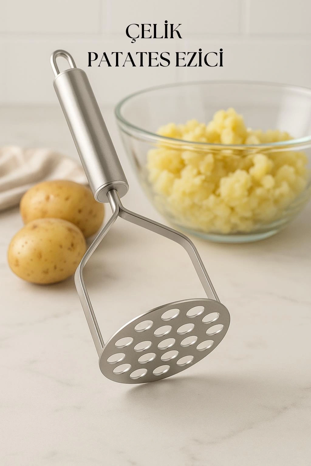 Ürün Hikayesi: Dayanıklı paslanmaz çelik saplı patates ezici, mutfakta pratik çözümler sunar. Ezme ve püre yapma işlemlerini kolaylaştırır, ergonomik tasarımı sayesinde uzun süre kullanım sağlar.