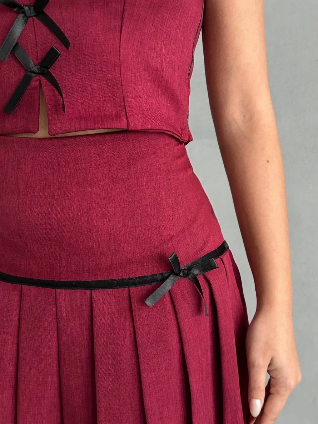 Pileli etek yelek takım bordo S255015, gardırobunuzun vazgeçilmezi olmaya aday!