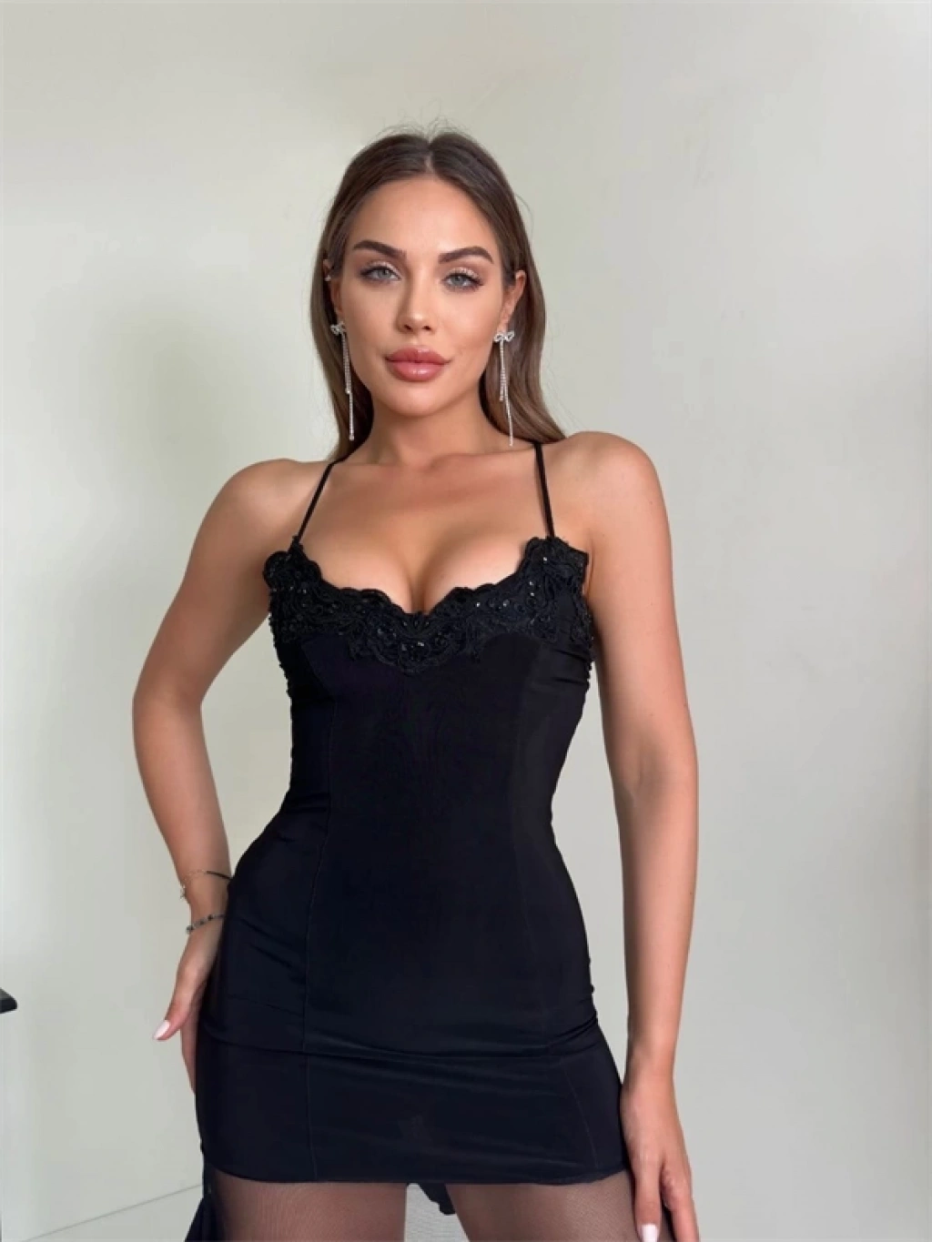 Düz Bisiklet Yaka Kadın Siyah Mini Elbise