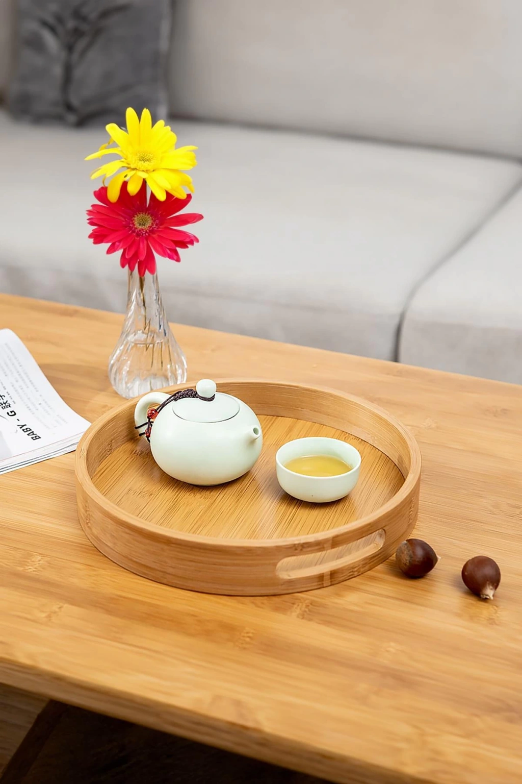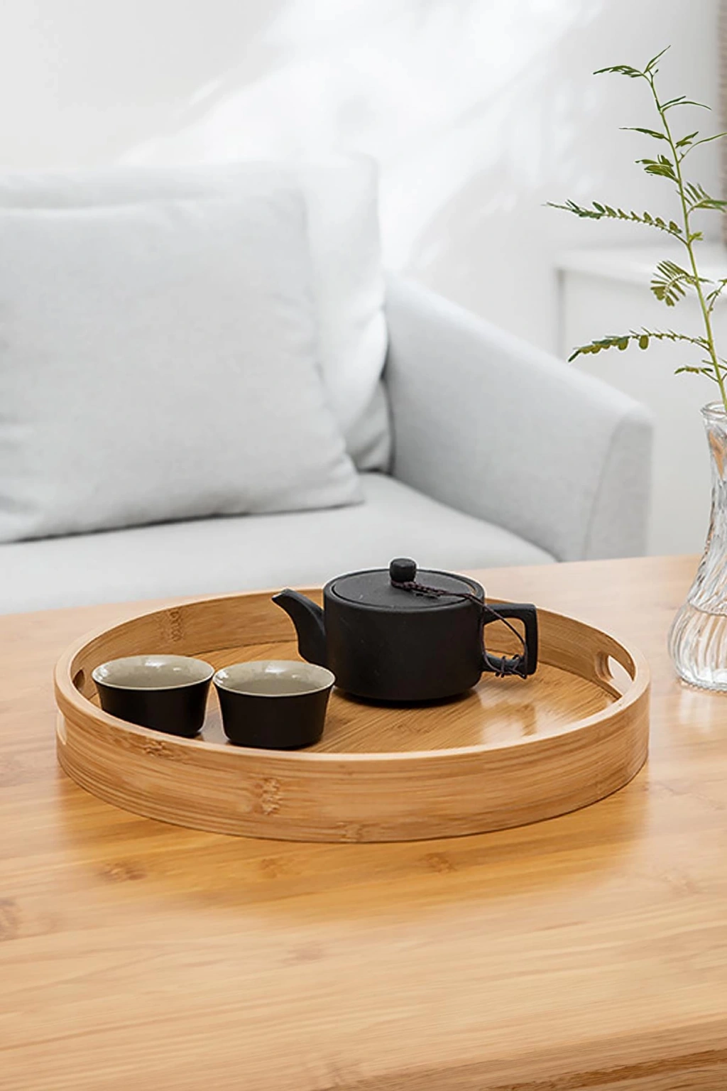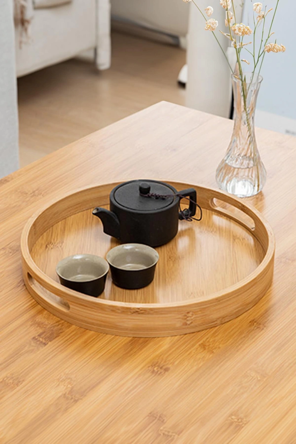 Doğal bambudan üretilmiş yuvarlak tepsi, geniş boyutu sayesinde çay, kahve, atıştırmalık ve servis sunumları için idealdir. Zarif tasarımıyla hem evinizde hem de iş yerinizde sofralara şıklık katar. Sağlam yapısı ve doğal görünümüyle uzun yıllar keyifle kullanabilirsiniz.